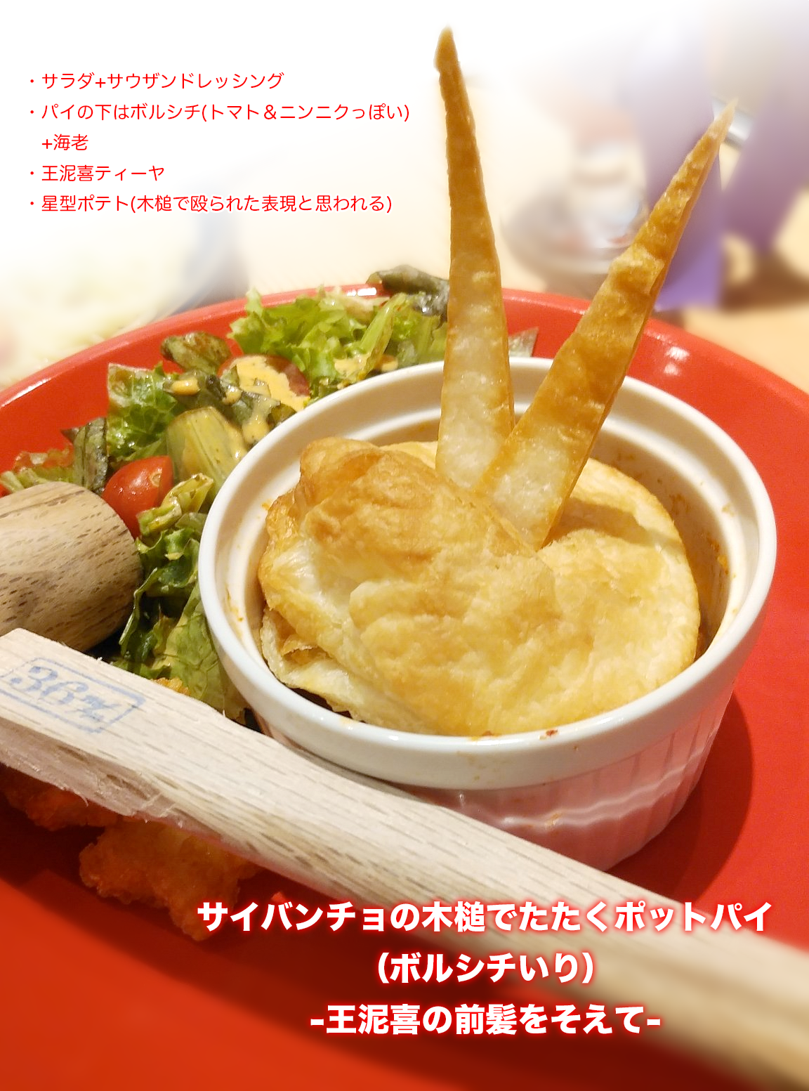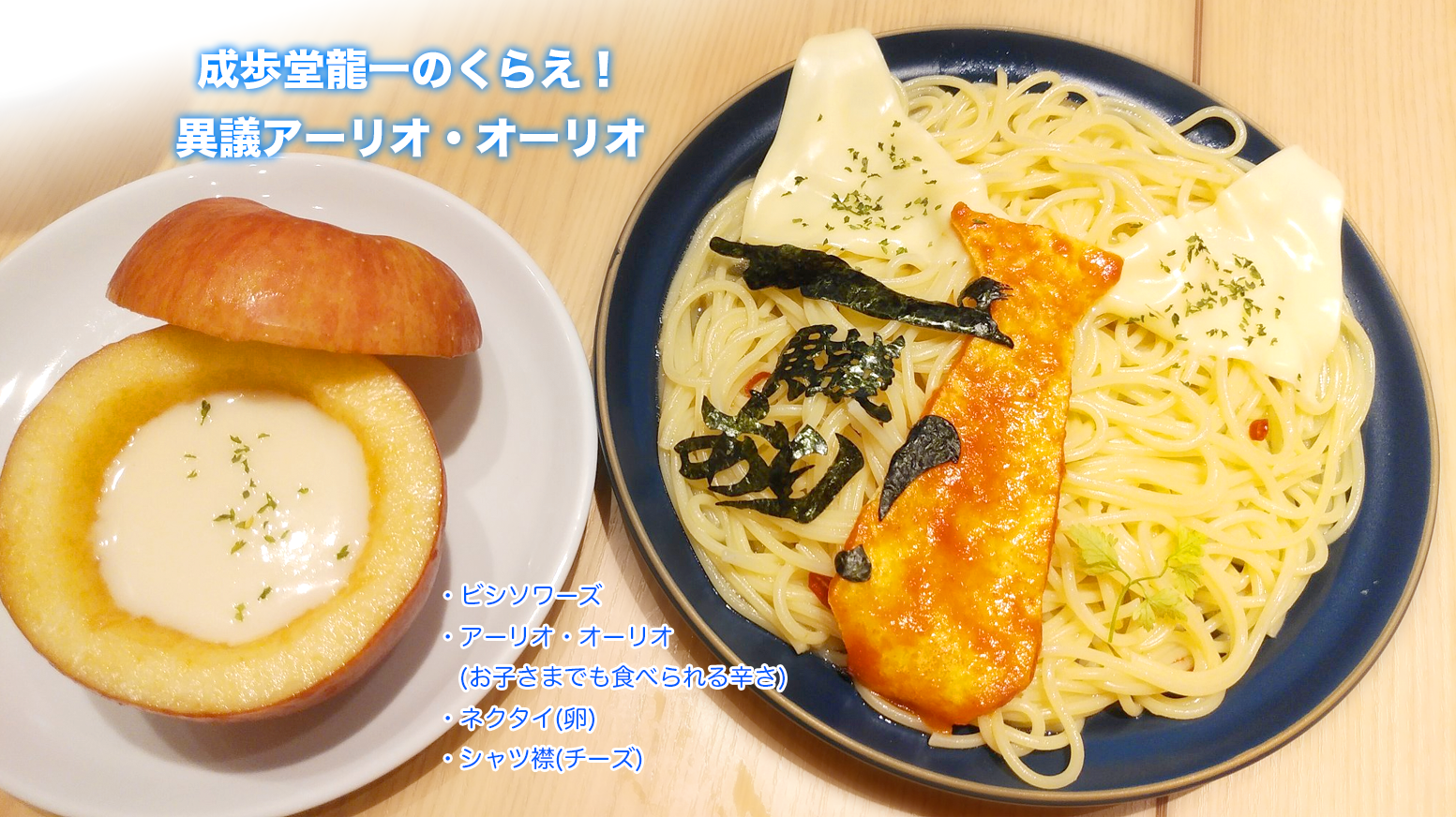 「サイバンチョの木槌でパイを割ってね!」とのことでサクっと割れるかと思いきや、汁を吸ったパイがみっしりしっとりとした感触になり、何度も叩くうちに本当に王泥喜くんのオデコを殴っている気分になってくるという人としての良心を試されるメニュー(結局ナイフで切り分けた)。